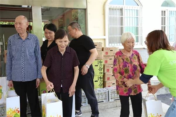 綠(lǜ)葉果業(yè)集團總經理(lǐ)唐紅(hóng)給敬老(lǎo)院的(de)老(lǎo)人(rén)們發鮮果、月(yu✔è)餅禮盒