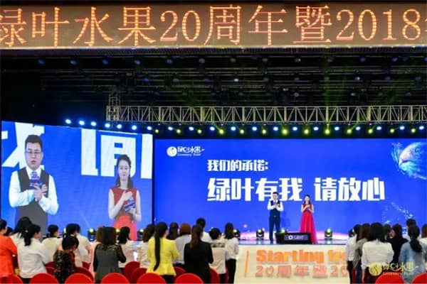 4月(yuè)10日(rì),綠(lǜ)葉水(shuǐ)果20周年(nián)暨2018年(nián)度盛典在長(chá$ng)沙聖爵菲斯大(dà)酒店(diàn)盛大(dà)召開(kāi),水(shuǐ)果行(xíng)業(yè)大(dà)佬、合作(zuò)客戶以及社會(huì)各界人(rén)士,和(γhé)千餘名綠(lǜ)葉人(rén)歡聚一(yī)堂,共同見(jiàn)證綠(lǜ)葉二十年(nián)來(lái)的(de)蝶變和(hé)輝煌。