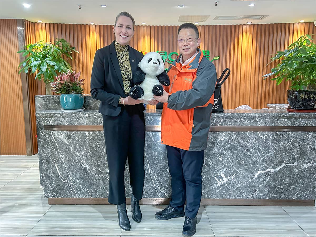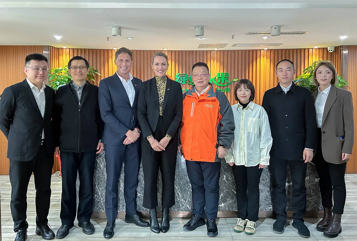 11月(yuè)30日(rì),新西(xī)蘭駐廣州總領事(shì)柯瑞秋女(nǚ)士一(yī)行(xíng)到(dào)訪綠(lǜ<)葉水(shuǐ)果并參觀交流,綠(lǜ)葉水(shuǐ)果總經理(lǐ)唐紅(hóng)陪同接待。