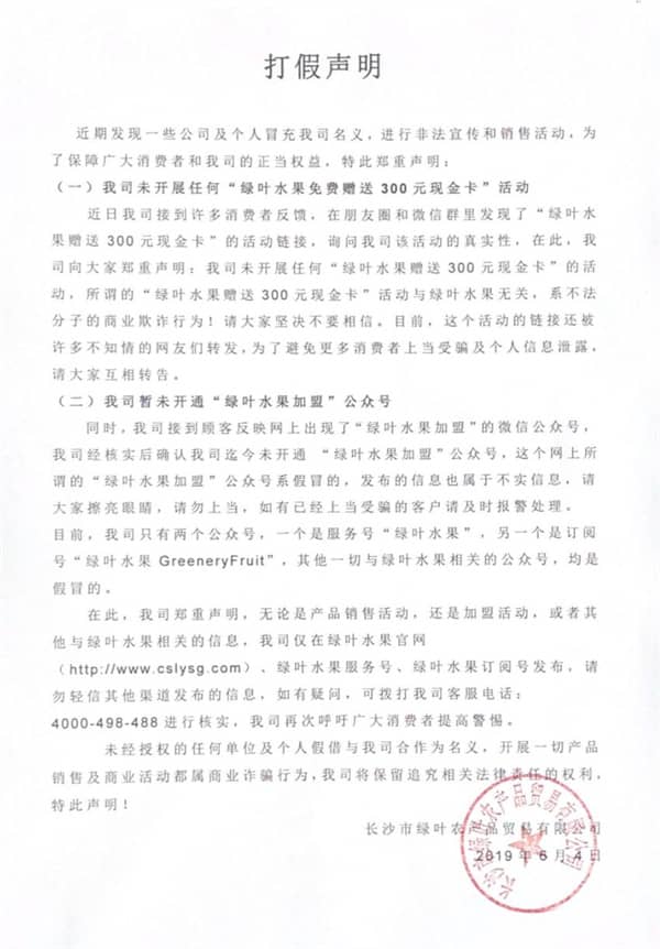 (一(yī))我司未開(kāi)展任何“綠(lǜ)葉水(shuǐ)果免費(fèi)贈送300元現(xiàn)金(jīn)卡”活動