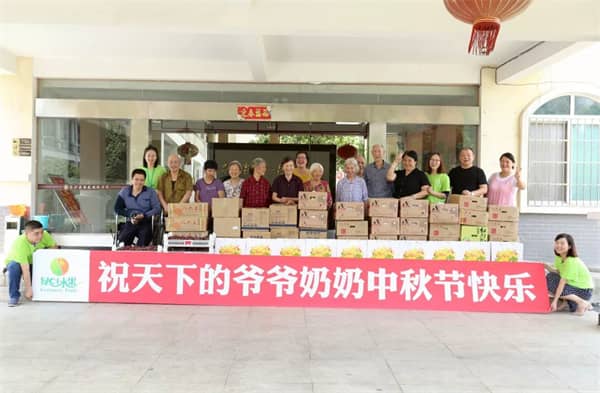綠(lǜ)葉果業(yè)集團總經理(lǐ)唐紅(hóng)給敬老(lǎo)院的(de)老(lǎo)人(rén)們發鮮果、月(yu✔è)餅禮盒